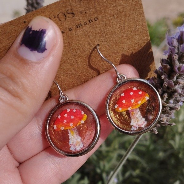Aros pintados a mano. Circulo de metal fantasia, relleno de resina uv y gancho de acero quirúrgico.