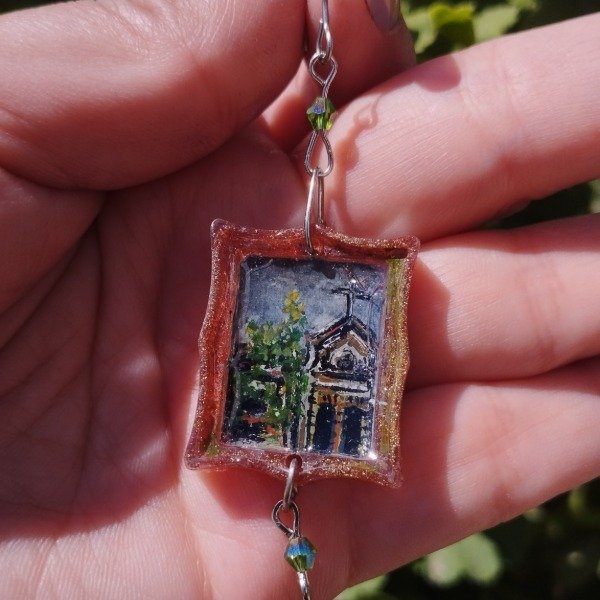 Aros con base de resina y ganchito de acero quirúrgico. Pintado completamente a mano, protegido con resina.