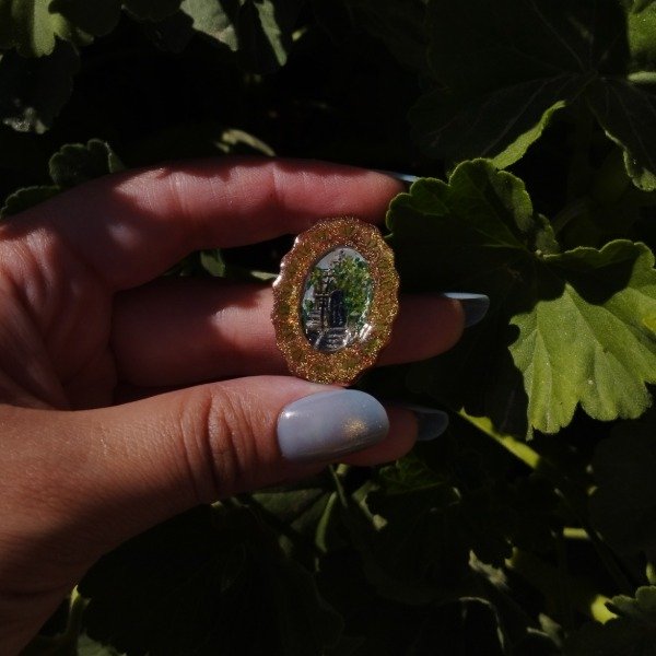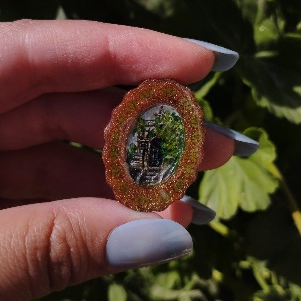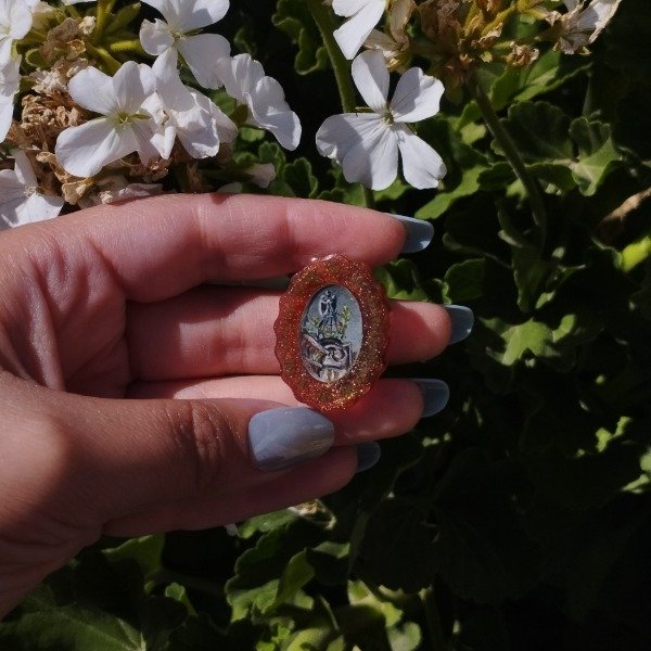 Prendedor con base de resina y ganchito de metal. Pintado completamente a mano, protegido con resina.