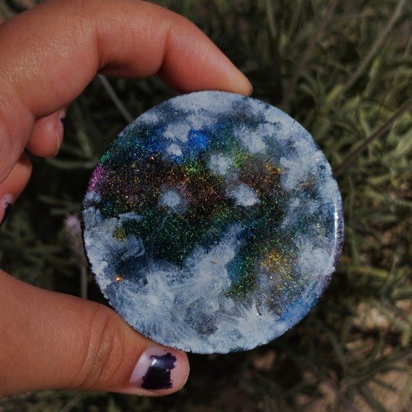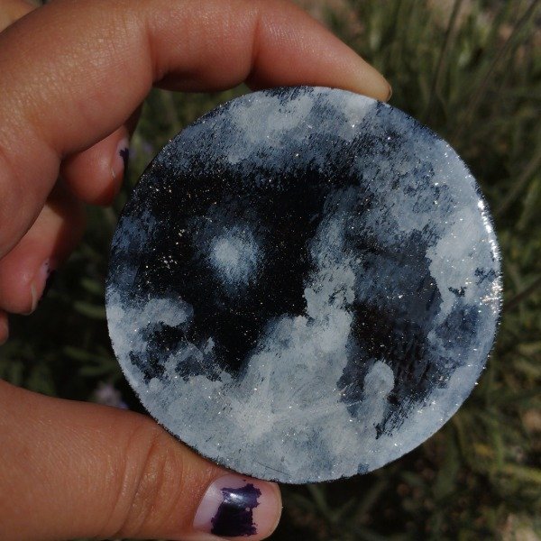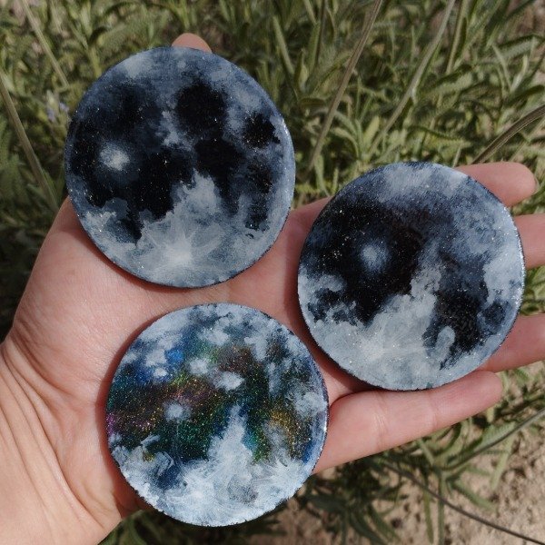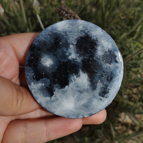 Imanes en base de madera de 6cmx0.5cm de espesor. Tienen lunas pintadas en acrílico y barnizadas con un sutil relieve y pigmentos encapsulados.