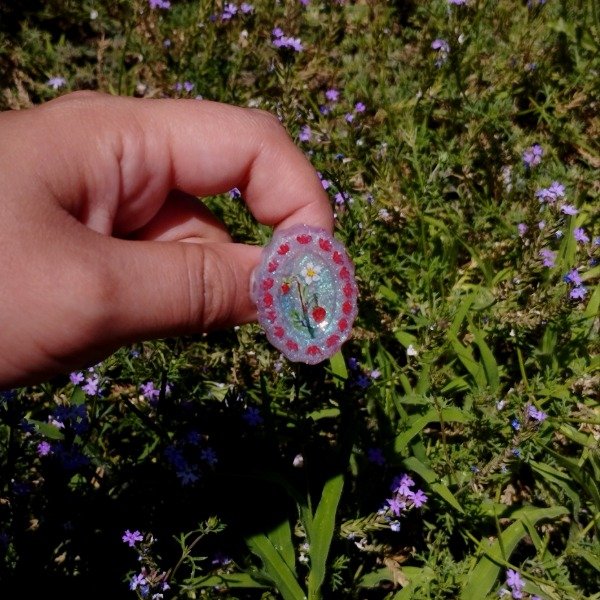 Prendedor con base de resina y ganchito de metal. Pintado completamente a mano, protegido con resina.