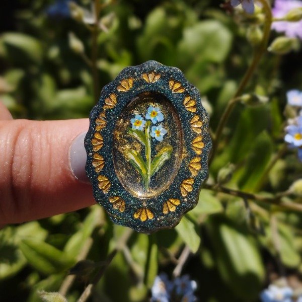 Prendedor con base de resina y ganchito de metal. Pintado completamente a mano, protegido con resina.